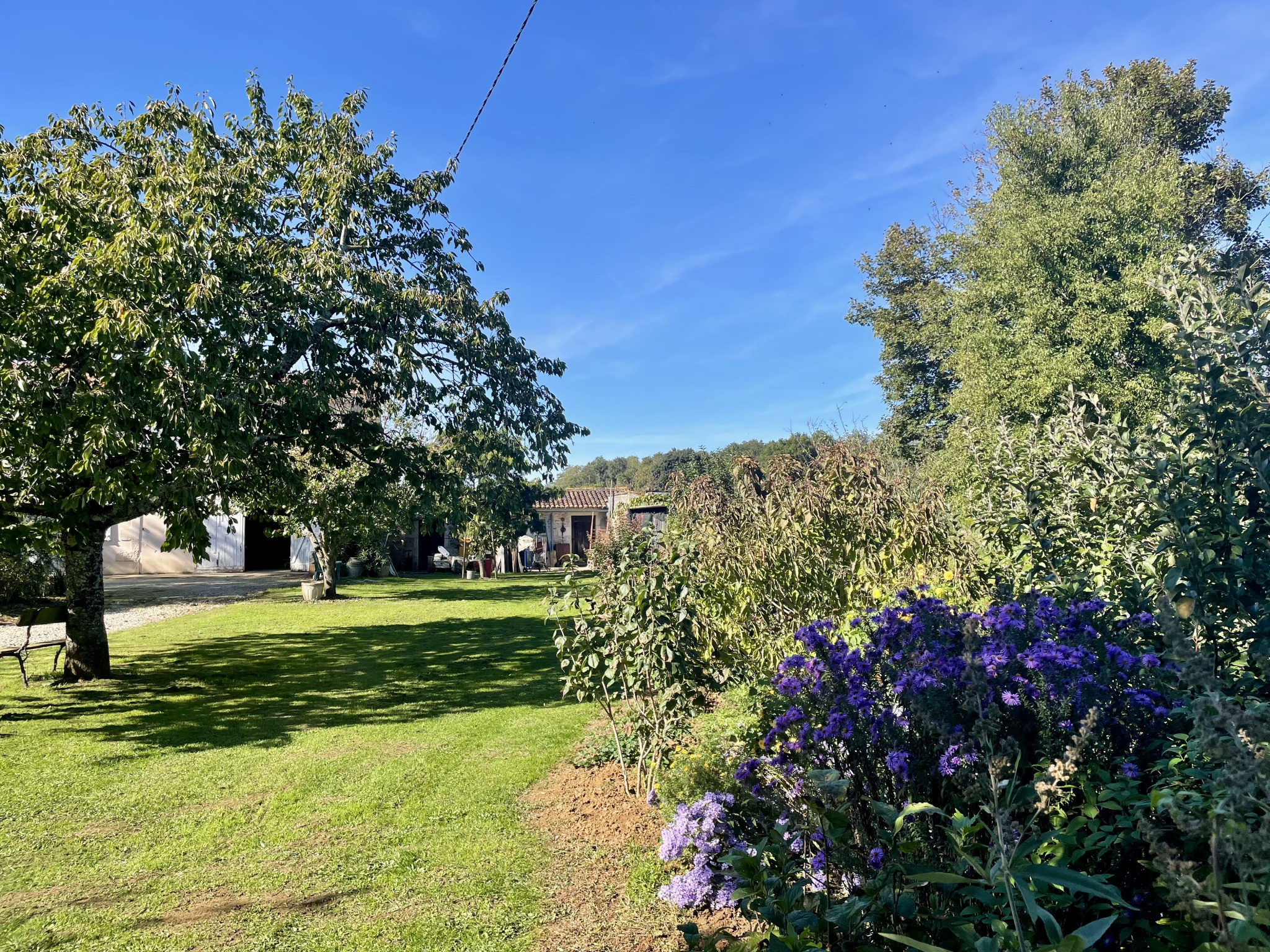 Le grand jardin arboré dispose d’un potager et d’un verger tous les deux prospères grâce à la qualité du sol, d’un puits alimentant l’ensemble de la parcelle et de cabanons.