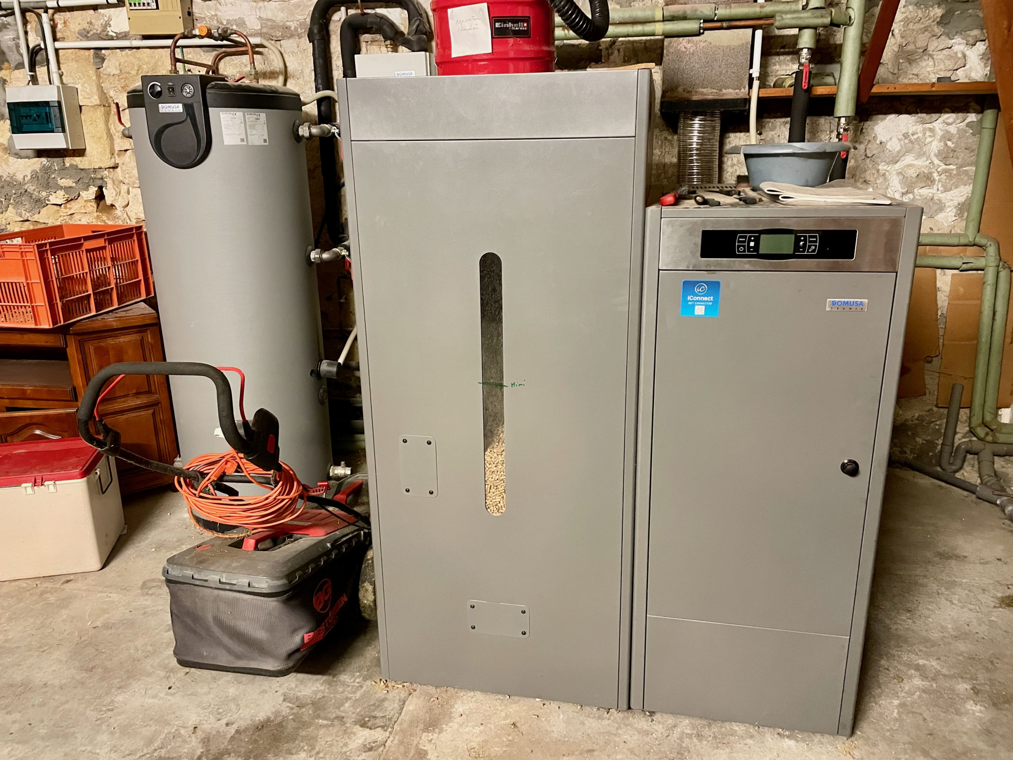 Le chauffage central et la production d’eau chaude sont assurés par une chaudière à granulés très récente se trouvant dans le grand garage attenant.