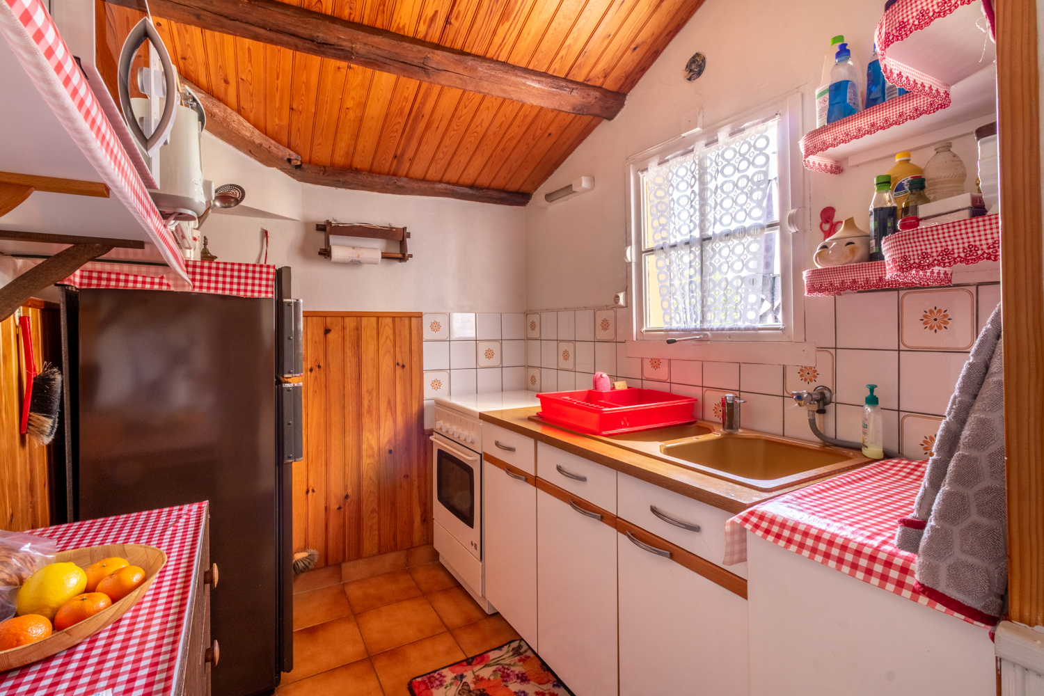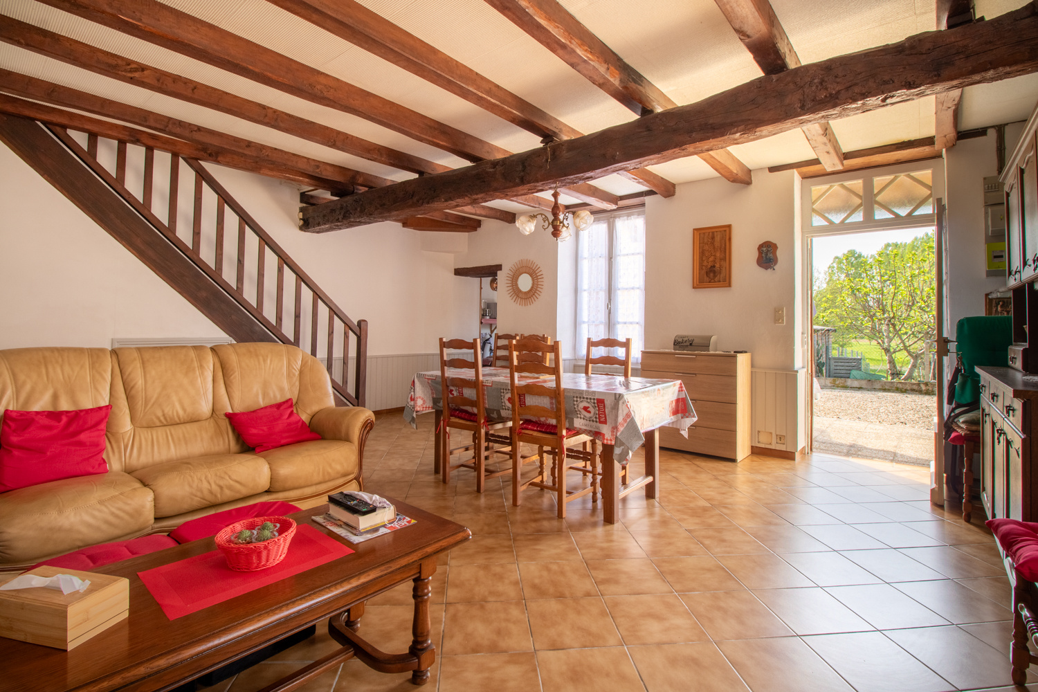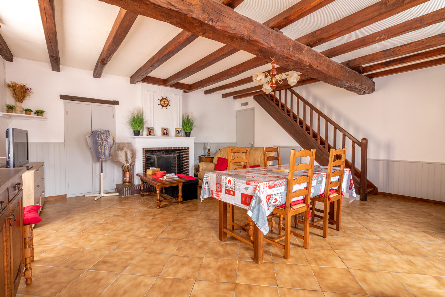 Au rez-de-chaussée, la maison se compose d’un salon/séjour lumineux d’environ 29 m2, d’une cuisine indépendante ainsi que d’un WC dont l’accès se fait par l’extérieur. Vous serez séduit par le charme de l’ancien avec ses poutres apparentes et sa cheminée.